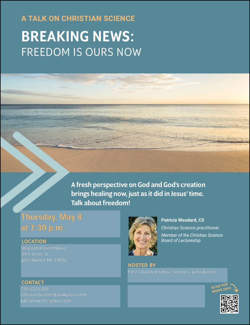 And it lifts all of us and can heal all of us. I’ll share the way Christian Science has brought healing to my own life, rescuing me from a troubling situation with my teenage daughter, and freeing me from the effects of an accident, as well as examples of how it has helped others from different walks of life. The common thread through these experiences is the way a clearer view of the reality of our God-given wholeness also releases us from burdens in our lives and causes us to soar. Free!
